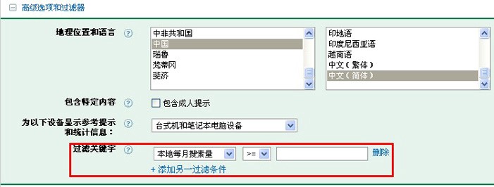 ??在查找關鍵詞這里,有一個“高級選項和過濾器”,該選擇器的目的是幫助你獲得更加精確的結果,可以過濾掉一些熱度較低的關鍵詞。當然,你可以選擇默認的值,不做限制。