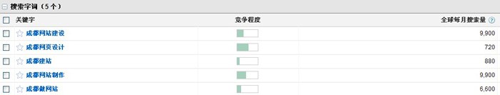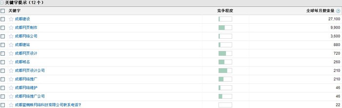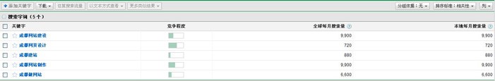 ??在上面返回的結果中,我們發現“成都建設”這個關鍵詞的熱度很高,而競爭程度卻很低。但是這個詞其意義范疇很大,可以基本排除。而“成都網頁制作”這個關鍵詞就是我們剛剛實驗的5個關鍵詞中沒有的,其搜索熱度和競爭程度都很高。第三個引起我們關注的是“成都網絡公司”這個關鍵詞,其熱度雖然只有“成都網頁制作”的1/3,但是競爭程度卻是非常低的。這個關鍵詞也可以重點考慮一下。